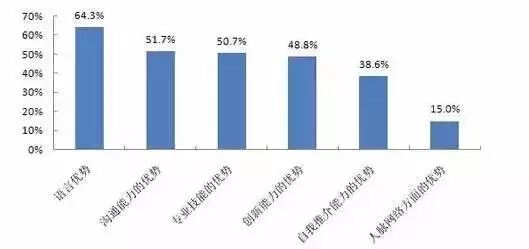 语言和沟通能力是海归就业的主要优势。海归认为其留学的优势主要体现在语言、沟通能力方面,分别有64.3%和51.7%的海归认为自己在这两方面具有优势。分别有50.7%和48.8%的海归认为自己在专业技能和创新能力方面具有优势。另有38.6%认为在自我推介能力占优势。仅有15%的海归认为自己在人脉网络占优势。