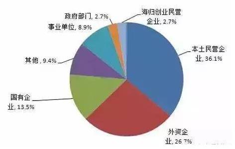 海归就业的单位类型呈现多样化,但主要集中在民营企业和外资企业。36.1%的海归在本土民营企业,26.7%的海归在外资企业,13.5%的海归在国有企业,8.9%的海归在事业单位,在政府部门和海归创业民营企业的各占2.7%。