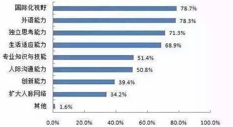 出国留学获得的提升主要体现在国际化视野、外语能力、独立思考能力、生活适应能力等方面,认可度分别为78.7%、78.3%、71.3%、68.9%。专业知识与技能、人际沟通能力的占比也均超过50%,相对而言,创新能力和扩大人脉网络的比例较低,分别为39.4%和34.2%。