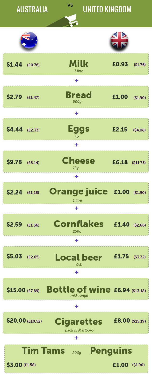 就拿最常见的日常购物来说,有些在英国更贵,有些在澳洲更贵,整体来说,两个国家不相上下