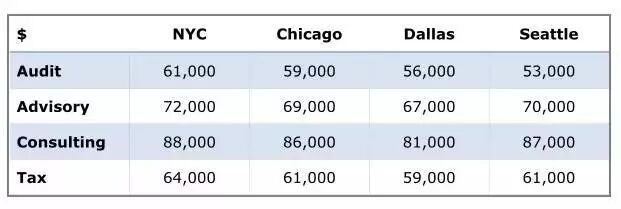 将从哪些方面了解四大薪资结构? 本文会提供一些特定的数据点,从而全面了解四大薪酬结构: 起薪——入门级别员工的薪资水平 晋升时间线——确定需要多长时间才能晋升到各个级别,以及每个级别的薪资水平 合伙人的薪资——看看一个典型的合伙人究竟赚了多少钱 奖金——对可能期望的平均奖金有一些了解 职业收入——在你的整个职业生涯中能获得的收入 For Starters – Big 4 Consultant 有很多因素决定了入职后的工作内容和薪资水平: 办公室的位置。任何住在纽约的人都知道这是个令人悲伤的故事...所以这一因素也会在一定程度上反映在你的起薪中。 具体的业务。为什么德勤的税务员工要比德勤的审计员工挣得更多呢?有些毕业生的工作本质上比其他人更有价值。这主要是供给和需求的原因,更少的供给或更多的需求=更高的价格。 学历水平。一个博士候选人要比一个拥有学士学位的候选人获得更高的薪水(而且他们通常会获得一个高级的职位。哈佛博士学位直接进入了安永的经理级别吗?)。另一方面,虽然硕士学位不会给你更高的职位,但你会得到10%-15%的初始工资增长。 考虑到所有这些因素,那么入职第一年的收入会是多少呢? Moving on Up – Big 4 Senior 入职后的你工作很努力,就这样安安稳稳地过了两三年时间,也几乎没有把事情搞砸,所以轻松地晋升到了初级顾问。 晋升通常发生在你第二年的年底(或者普华永道的第三年),薪资已经能达到以下水平了: 在四大的薪资同比增长率大已经达到约14%,而美国的平均年薪同比增率仅仅只有2.9%。 Starting to Lead the Way – Big 4 Manager 当成为四大经理的这一刻,将真正开始专业化,成为企业的一个必不可少的一部分。你将开始定期主持会议,并与更高级别的客户进行电话会议。甚至会有足够的权利来决定和改变你的项目,如果完成的好也会得到丰厚的奖励。 然而,在你变得兴奋之前,想告诉你一件重要的事实:四大晋升不是严格基于“时间服务”的,而是在那段时间获得的技能和证书。 而达到一定的技能水平需要的时间是最少的。晋升会评估你是否完成了所有必要的晋升标准: 有适当的技术知识 展示适当的领导能力和技巧 获得所需的专业证书(例如完成注册会计师) 其他因素 晋升通常需要5到7年的时间,具体会根据公司和实际情况而定的不同。第一年经理的薪资比高级经理岗位的要少得多: 这里也有一些有趣的观察: 西雅图在咨询薪酬方面已经落后于芝加哥。也许咨询经理的价值不如哪个其他办公室的新员工。 纽约市仍是薪资水平最高的地方。 Getting into the Big Time – Big 4 Senior Manager 如果你没有完全的动力和奉献精神(愿意牺牲你的生命……),高级经理会是一个很好的选择。高级管理人员负责项目从开始正常运行到结束。还可以接触到最大的客户,当然并不是什么事情都需要亲力亲为。 晋升到高级经理通常需要提交一份“商业案例”,来证明你已经准备好了。 与经理晋升非常类似,这个业务案例将包括一组需要满足的需求。但对于高级管理人员来说,他们更关注的是领导力、人的发展和收入。 许多大公司只有当他们期望你有机会成为合伙人的时候才会提拔到高级经理。 通常需要7到10年的时间才能晋升到高级经理,当然薪资水平也是很丰厚的: The Odd One Out – Big 4 Director 先看看下面的图表,它给出了高级经理之后的职业道路的概述。 在一些公司(B公司)中,高级经理有两条途径,要么是董事,要么是合伙人: 董事:对董事来说,要晋升为合伙人是非常困难的。你可能会得到一份不错的薪水,但它永远不会在合伙人的级别上。在其他公司(例如A公司)中,董事是一个明确的级别,必须在有资格晋升为合伙人之前通过。 授薪合伙人:授薪合伙人与合伙人有许多相同的权利和义务,关键的区别在于他们有或没有公司的任何股权。授薪合伙人挣的是一份典型的薪水(就像我们其他人一样),而不是获得利润分成。 不过幸运的是,在这两种情况下,工资水平都差不多。 晋升到董事的时间将从10年到15年不等: Equity Time – Big 4 Partner 我们已经在这篇文章中讨论了关于合伙人薪酬的大量细节。总而言之,合伙人的收入在25万美元到500万美元之间,这取决于他们获得的合伙人的数量。而普通合伙人在职业生涯中可以获得近1200万美元的收入。 在作为合伙人的情况下,地区差异性小,合伙人的工资是会建立在“单位”(单位等于某一水平的收入,每个合伙人以相同数量的单位开始)的基础上的,这与合伙企业中的股票相当。 毕竟,这是在一个地区办事处工作的时候,意味着你可以得到更多的报酬。 通常需要13到17年才能成为一个合伙人。 Big 4 Bonuses 你是否期望在四大工作每年会得到很多奖金? 但事实却令人有些失望:四大的奖金没有大家想象中那么高。与金融不同的是,四大的薪资水平没有靠高额奖金维持。相反,是主要依靠每年的工资持续上涨的。 根据研究,奖金的中值是他们四大工资的8%。假如你在西雅图当一名审计高级主管,又或是纽约的咨询总监时,它的价格可以从5000美元到32000美元不等。 还有个悲伤的事实:顾问通常不会收到奖金。 研究还显示,奖金池的权重更偏向于高级员工。譬如,西雅图审计师的5000美元奖金将更可能是3000美元(4%的薪水),相比之下,董事的奖金为4.5万美元(11%)。 这时的奖金和薪水一样多,这代表了你整个团队
